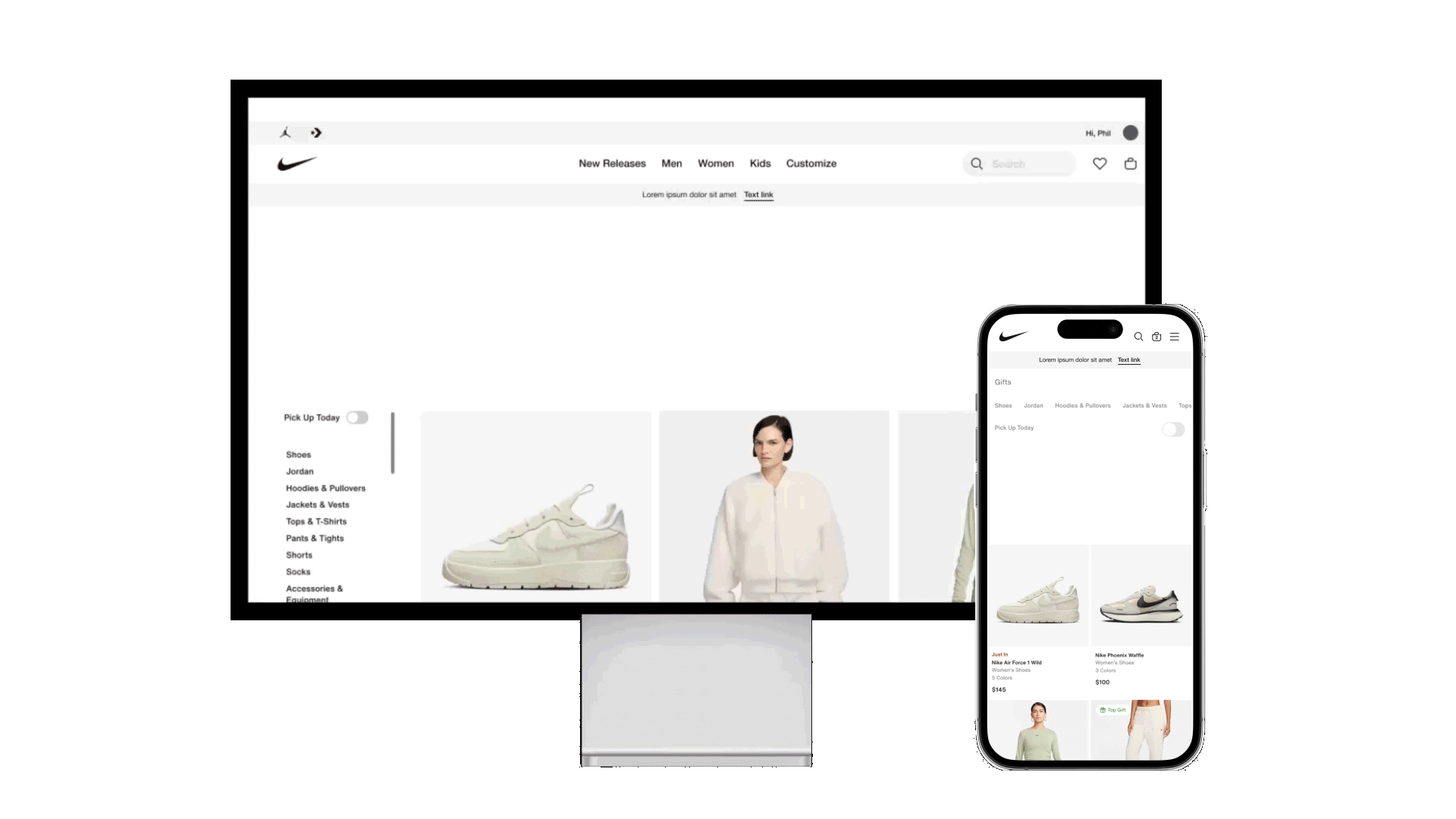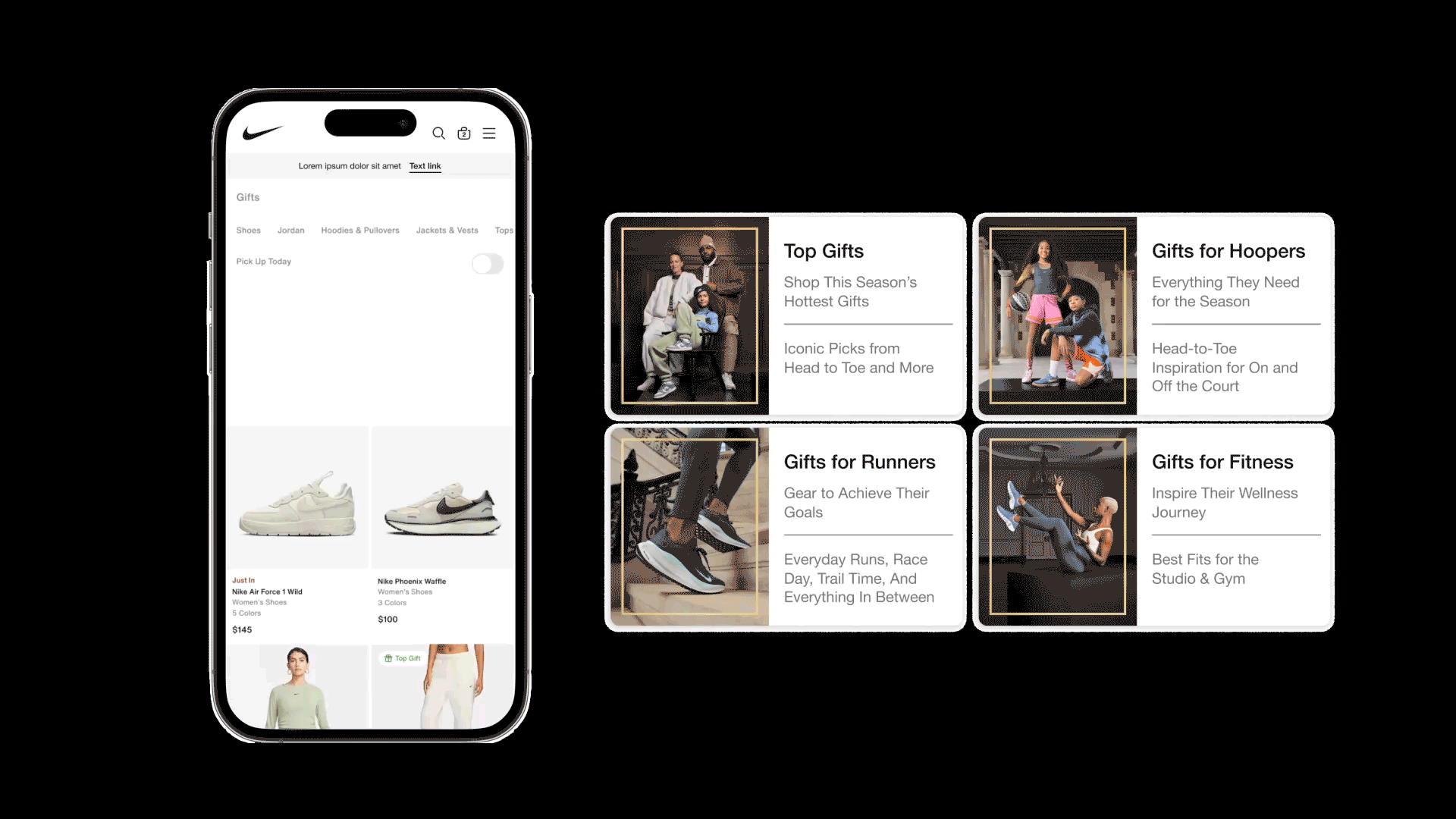 During my time at Thesis, I worked on various Nike digital initiatives, including the website, app, and email campaigns. One of the primary projects I led was a Platform Holiday (PWH) initiative for Holiday 2023, during which our client requested a new website deliverable that aligned with a holiday visual concept application. I leveraged the existing Nike design system to create an impactful asset featured on the website throughout the holiday season.